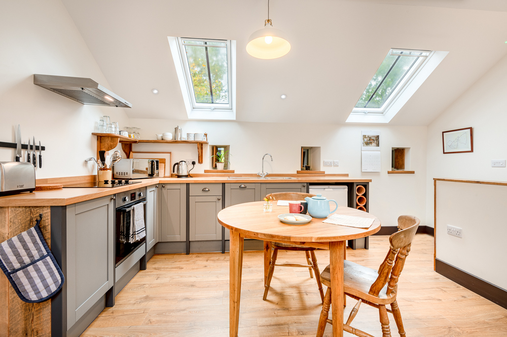 - Making the most of opportunities to bring in natural light, the open plan kitchen/dining/living area is upstairs under the eaves, providing a bright and relaxing space.