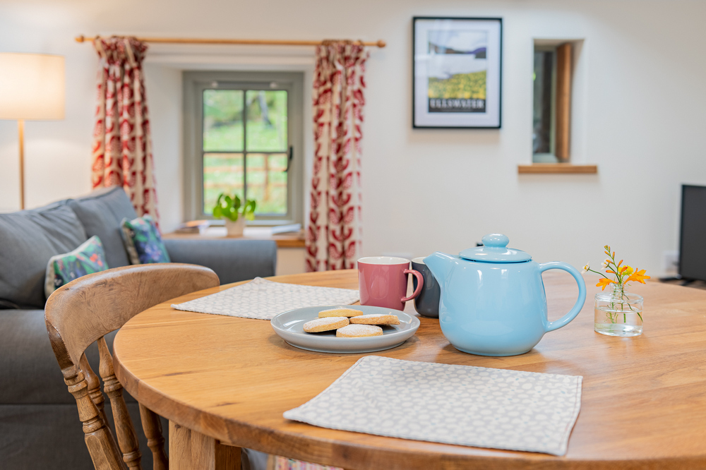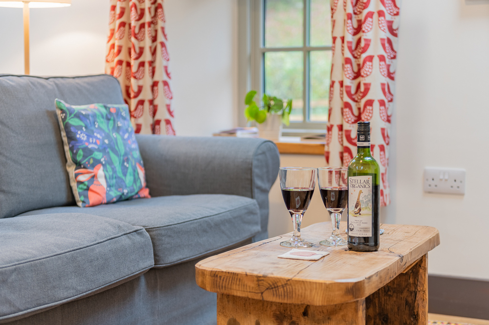 - The Byre opens up into the barnyard with views of the hills beyond. A seating area provides a space to sit and eat or simply relax with a drink while soaking up the outdoors.